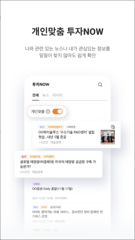 -내가 원하는 국내/해외주식과 상품, 투자정보를 하나의 키워드로 통합 검색하고, 내가 관심 있는 뉴스나 리서치, 금융정보를 일일이 찾지 않아도 통합 피드에서 모아볼 수 있습니다.